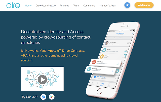 DIRO is the decentralized identification and access to an application that is supported by your crowdsourcing contact list {on the network, on the Internet, on the application, on the IoT, on the contract, on smart VR, AR and other domains using resources). Automated, organized and always updated contacts with one click of access to the service. Make your contacts alive - whether it's IVR, waiting time, last appointment or just miles or preferences with universal access without access from your contacts.